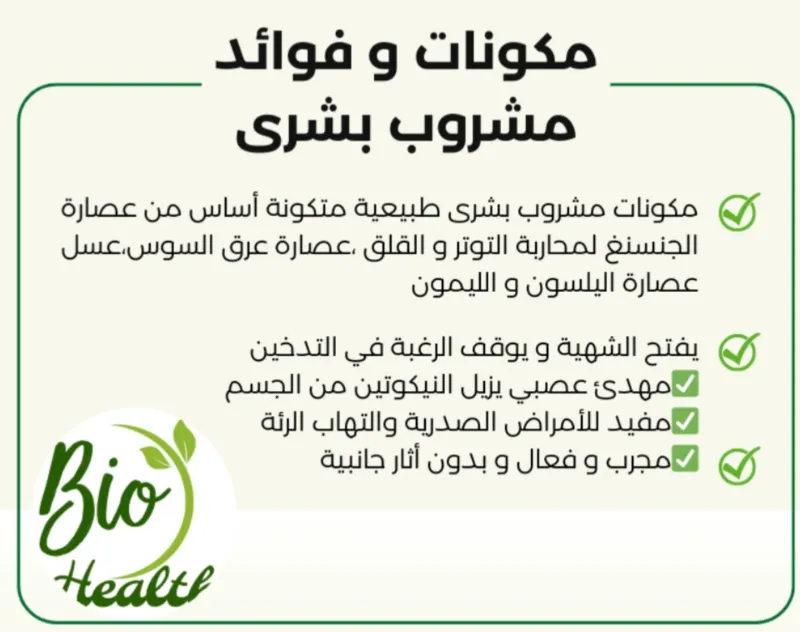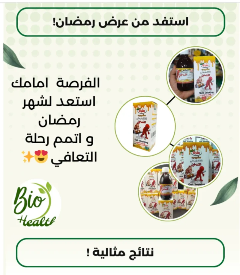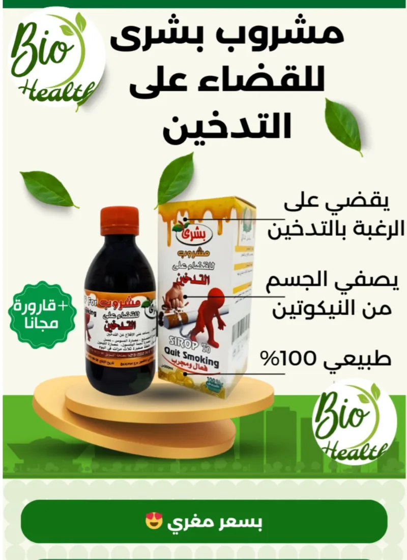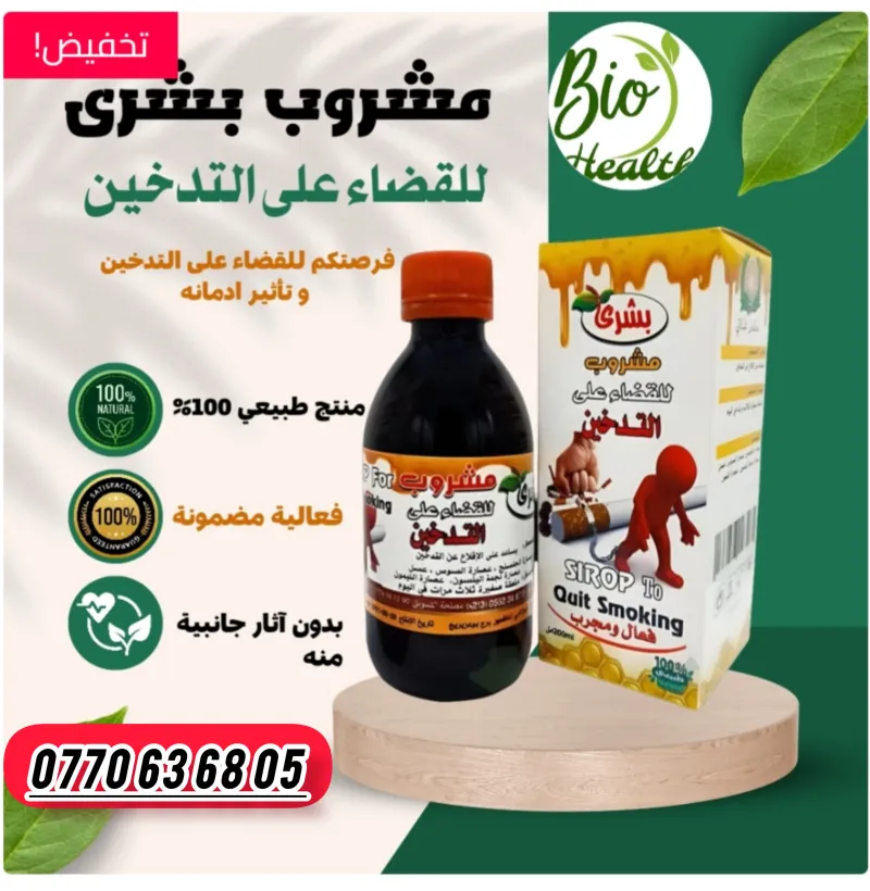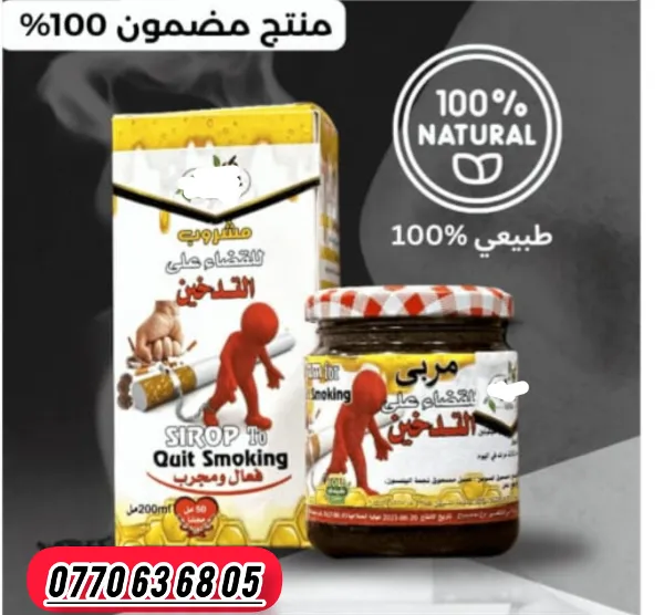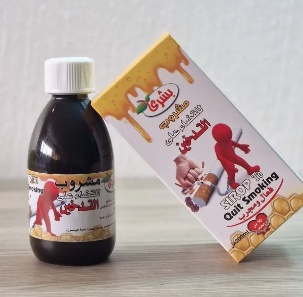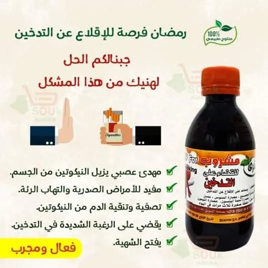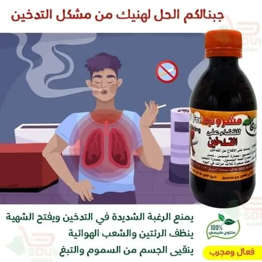 التدخين هو عملية حرق التبغ و تنشيط الدخان الناتج للإستنشاق . يتم ذلك عادة عن طريق تعليق السيجارة أو الدخان في الفم و إشعالها . مما يؤدي إلى إطلاق مجموعة متنوعة من المركبات الكيميائية الضارة و الغازات السامة التي يمكن إستنشاقها في الرئتين و الجسم . هذا يسبب تأثيرات صحية خطيرة . بما في ذلك الإصابة بأمراض القلب و الرئة و السرطان . منتج طبيعي و فعال 100%. مهدئ للأعصاب و فاتح للشهية. يقضي على الرغبة الشديدة للتدخين. مفيد لالتهابات الرئة و الجهاز التنفسي. يعمل على إزالة النيكوتين من الدم. يحتوي على : عصارة الجنسنج + عرق السوس + عصارة الليمون + نجمة الينسون.