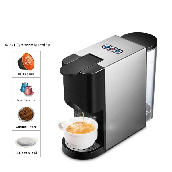 نقدم لكم آلة تحضير القهوة 4 في 1 من لتحضير القهوة احترافية و لذيذة كل صباح متعددة الاستخدامات لتتمتع بالذوق الأصلي للقهوة مناسبة للاستعمال المنزلي و المكتبي مصممة خصيصا لتحضير القهوة بكل سهولة واحترافية في دقائق معدودة يمكن استخدامها عن طريق القهوة المطحونة أو كبسولات بنظام الضغط العالي تم تصميم مضخة الاستخراج 20 بار خصيصًا للكشف عن الجودة الاستثنائية لـ كبسولات نسبرسو و دولتشي غوستو والقهوة المطحونة