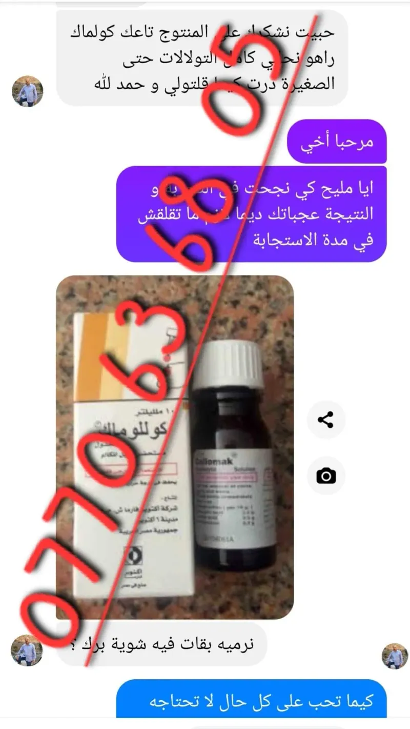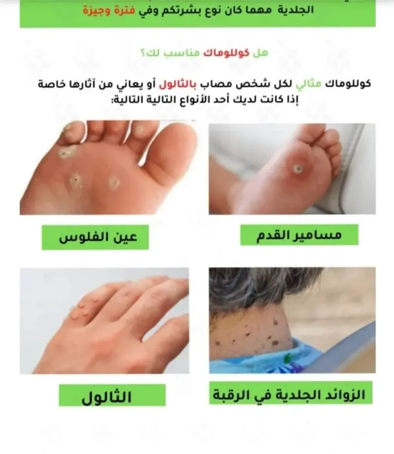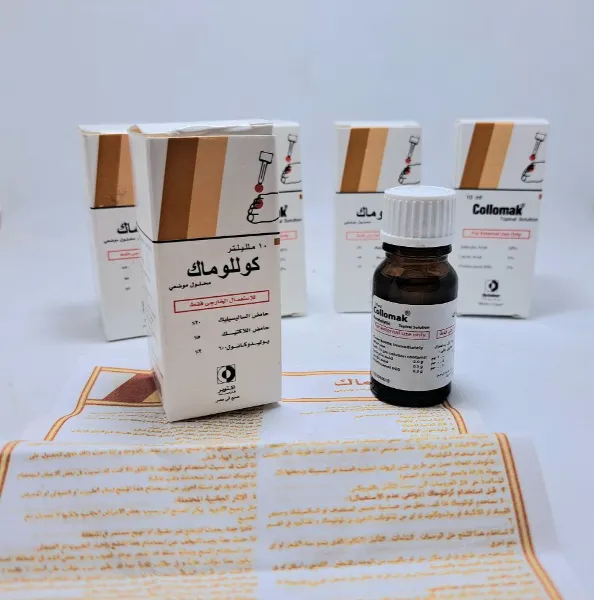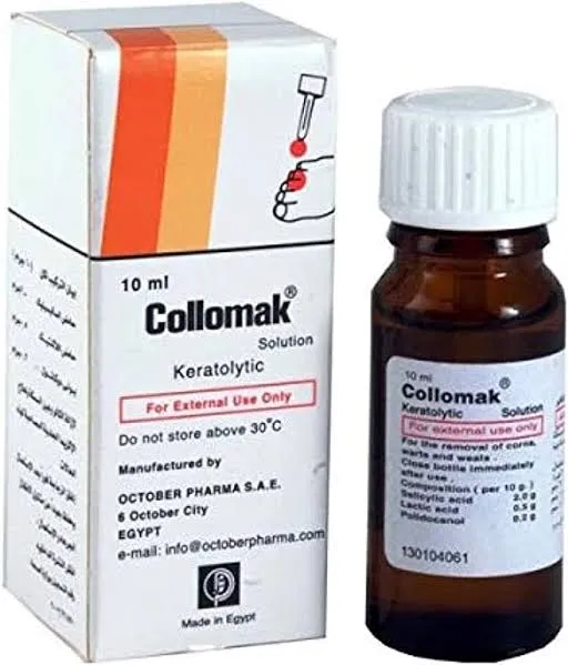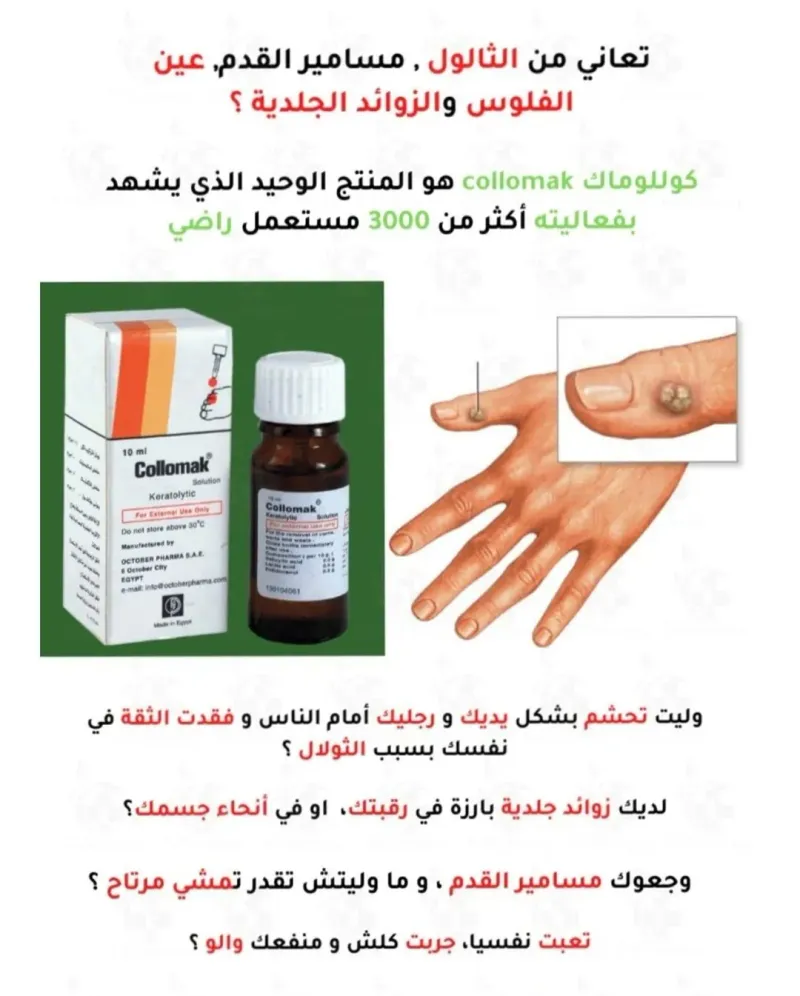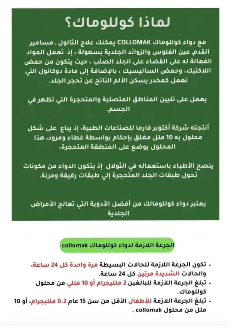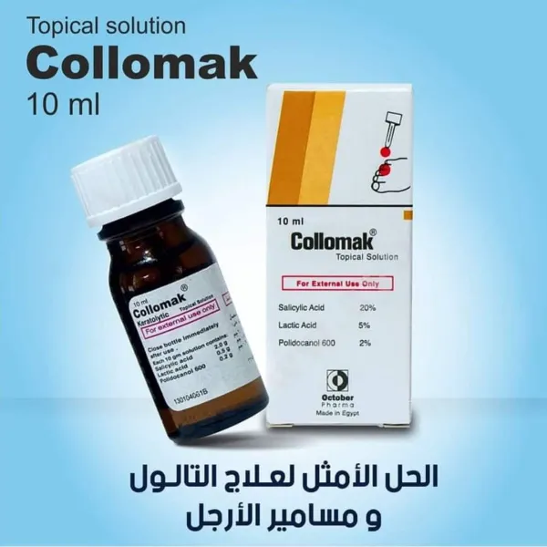 📢#صنع في مصر 🇪🇬made inÉgypte ✨كولوماك Collomak لعلاج الثولال الفوري🇪🇬🇪🇬 ✅️يعتبر محلول كوللوماك Collomak من أكثر الأدوية التي تساعد على علاج تصلبات الجلد بشكل سريع، ✅️ويعتبر دواء كوللوماك الحل الأمثل لمثل هذه الأمراض. حيث أنه يحتوي على حمض اللاكتيك الذي يقوم بمعالجة عين السمكة وهي عبارة عن أورام جلدية حميدة ومعالجة الكالو، وله تأثير فعال في معالجة مسامير القدم، ✅️ كما أنه يساعد على تقليل الألم بصورة كبيرة فور وضعه لأنه يحتوي على نسبة عالية من المخدر الموضعي بولي دوكانول. 👈 الجرعة وطريقة إستعمال كولوماك الموضعي: توضع طبقة رقيقة من المحلول على المنطقة المصابة مباشرة مرتين يوميا ويجب تجنب ملامسة المحلول للجلد السليم المحيط بالمنطقة المصابة.